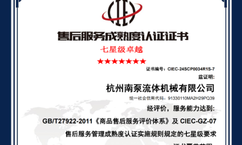 杭州南泵售后獲得《商品售后服務(wù)達(dá)標(biāo)認(rèn)證五星級證書》《售后服務(wù)體系管理成熟度認(rèn)證七星級(卓越)證書》等各類服務(wù)認(rèn)證